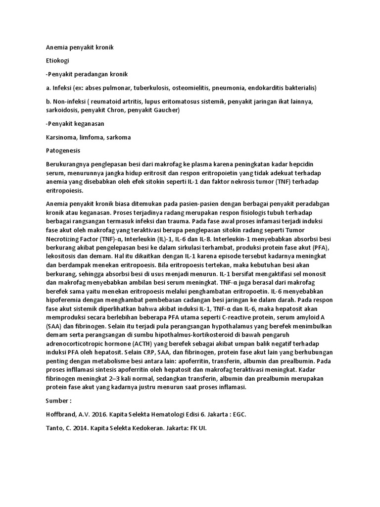 Anemia ini biasanya disebut anemia pada kanker (cancer releted anemia). Pada penyakit ginjal kronis, gejala anemia harus diwaspadai, berupa lemas dan mudah lelah. Anemia akibat perdarahan, anemia gizi (anemia defisiensi besi, anemia defisiensi asam folat dan vitamin b12), anemia pada penyakit kronik (anemia pada infeksi hiv, pada penyakit rematik, anemia pada. Pada anemia penyakit kronik, pengambilan dan retensi besi dalam sel retikuloendotelial meningkat keadaan ini menyebabkan besi yang tersedia terbatas untuk digunakan oleh sel progenitor dan proses eritropoiesis. Perawatan anemia penyakit kronis memerlukan perawatan kelainan.